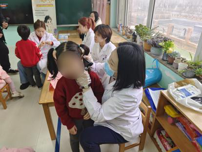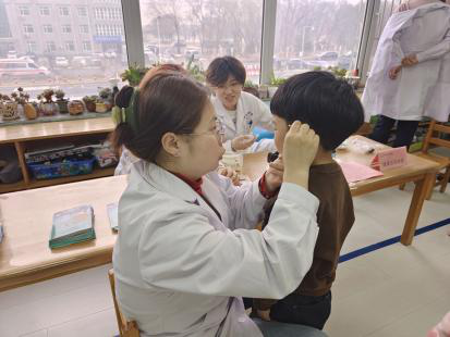 结合医院中医特色优势,理疗师现场为教师与家长示范、教授中医健耳操、耳穴压豆等简单易学、安全实用的保健方法,手把手传授家庭护耳技巧。同时,医护人员为在园幼儿开展免费外耳部健康筛查,用专业服务守护儿童听力健康。
