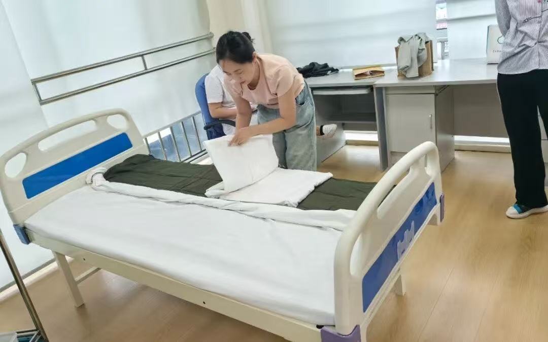 自开班后,市中心医院10名医疗护理员实践培训授课老师对首期招募的学员展开“理论授课+实操训练”相结合模式下的培训。课程内容涵盖了沟通技巧、消毒隔离、安全急救、等护理核心内容。